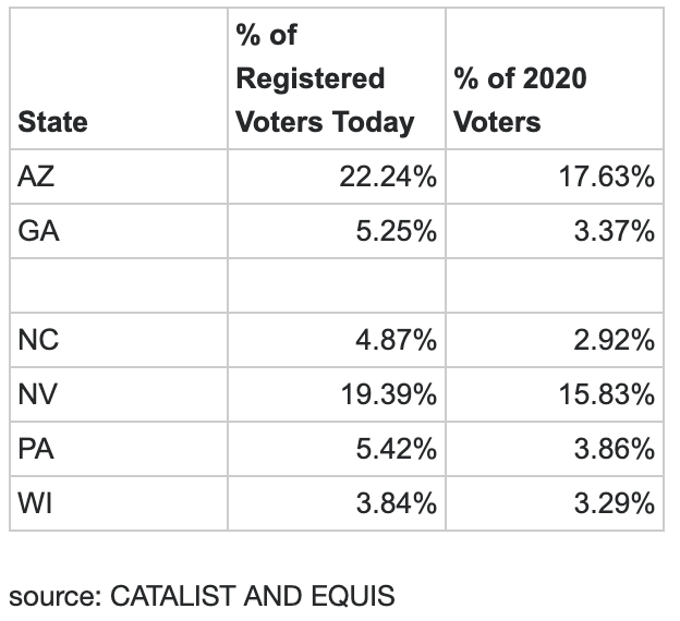 Latinos may comprise as much as 15% of the electorate this fall and have an outsized influence in most of the critical battleground states. In Arizona and Nevada Hispanics may be 20% or more of the vote. However, they may also be at least 5% in Pennsylvania, North Carolina and Georgia, three closely contested states.