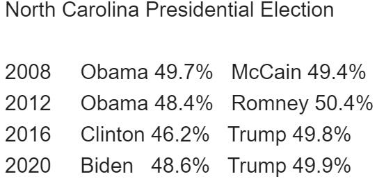 But Democrats fell short in the Tar Heel state in the next three national elections. Recent public polls and the Democrats private surveys both suggest a dead heat. The last few elections Democrats slightly underperformed the final polls.